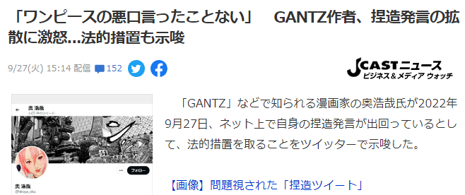 •奥浩哉经常玩SNS,这点在漫画界人尽皆知,与之相比,其他不少知名漫画家却几乎从不碰SNS,比如尾田大神,然而常在河边走难免会脏鞋,近日奥浩哉就被盯上了,多起对他不利的传言令其愤怒不已,直接要诉诸法律。