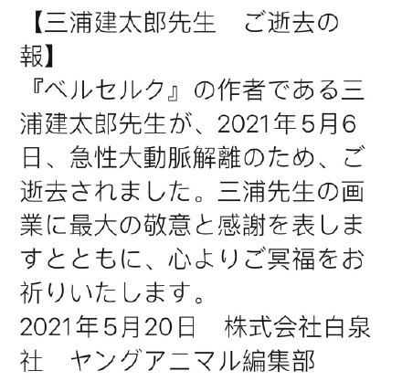 而三浦建太郎去世的消息引在网上引起了很多网友的热议,网友们对于这个消息都不敢相信,因为大家都还等着看《剑风传奇》的结局。而且,漫画近期的妖精岛剧情也开始渐入佳境,没想到在这个时候会听到这样的一个噩耗,或许就像某位网友说的那样,三浦真的乘船去妖精岛了。