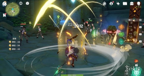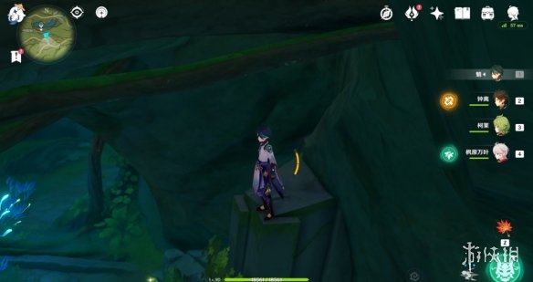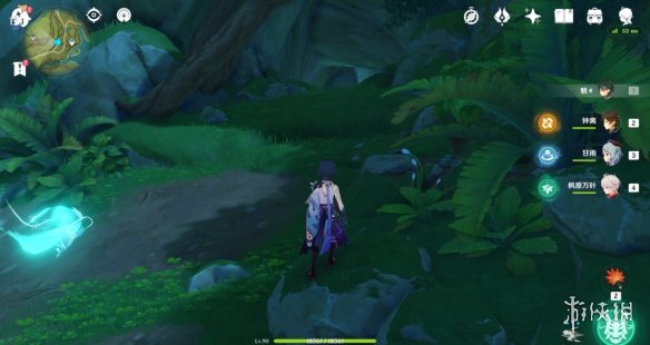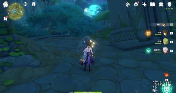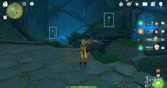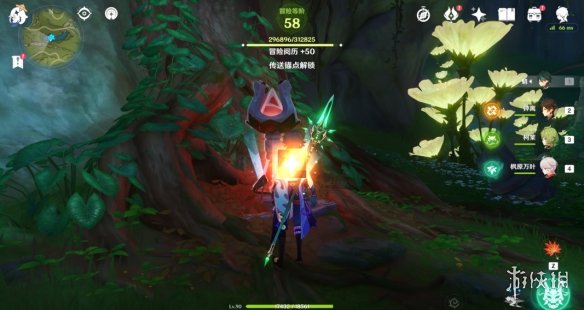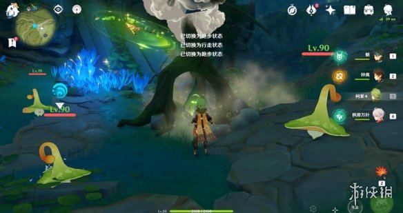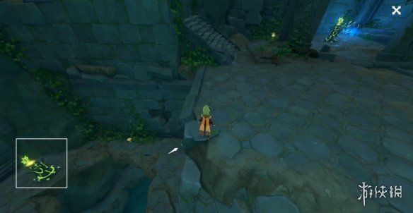 转身看向后面会发现一个藤蔓缠绕的石块,用草元素角色攻击后激活,出现蘑菇蕈兽,先清理一下。