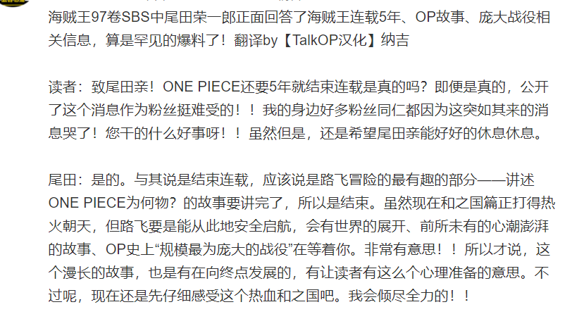 尾田在某个综艺节目中,多次跟大家表明,海贼王将会在五年内完结,这个消息一出,大家都觉得不靠谱,毕竟尾田一直都在拖稿子,海贼王现在的剧情,按照正常的套路来看,没个10年都不可能完结,但最近尾田的秘书也爆料说,海贼王确实会在5年内完结了。一开始我也认为,尾田不可能那么快就完成一部长篇巨作,但是当我看到这一则新闻之后,我瞬间就明白了,下面一起来分析下吧。