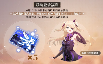 菲谢尔的上线除了丰富游戏玩法以外,还得益于她的获取方式,让很多新玩家早期即可将她作为驻场的主力角色来使用。在6月10日4.9版本更新后,玩家在活动期间首次登陆游戏即可领取sp女武神“断罪皇女”角色卡,也就是说在联动版本更新的第一天,大家就可以将菲谢尔带回家了。