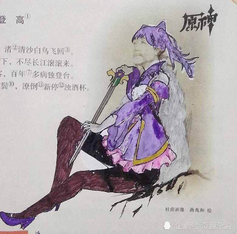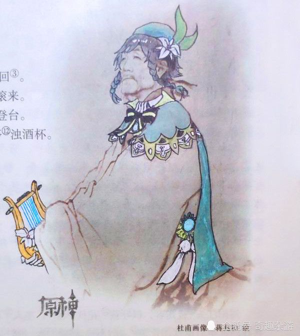要说在课本上绘画,那肯定要说语文书啊,而且必须得说一下高中语文课本中的“登高”,因为在它的旁边有一个杜甫的画像,很多人都非常喜欢在这个画像上添几笔,让它变得更加生动形象。比如说下面这个出自《原神》玩家之手的风神,这一看就不像是干正事的画像,简直是画出了巴巴托斯的精髓,太喜感了。