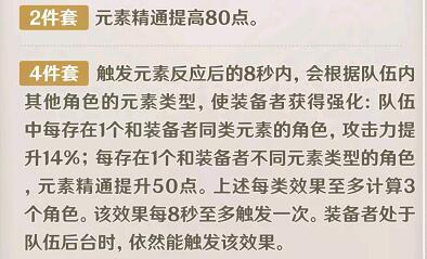 效果2件套,元素精通提高80点。4件套 触发元素反应后的8秒内,会根据队伍内 其他角色的元素类型,使装备者获得强化:队伍中每存在1个和装备者同类元素的角色,攻击力提升14%;每存在1个和装备者不同元素类型的角色,元素精通提升50点。上述每类效果至多计算3个角色。该效果每8秒至多触发一次。装备者处于队伍后台时,依然能触发该效果。