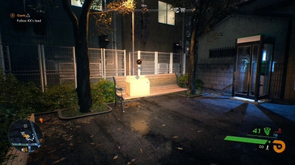 这只狸猫伪装成一个长凳上的米色纸板箱,位于电话亭的左侧。