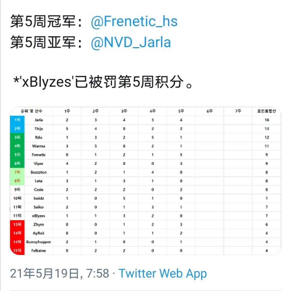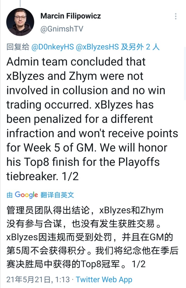 尽管xBlyzes表示非常沮丧,甚至这赛季剩下的比赛都不想打了。但是官方已经做出了处罚,调查结果是xBlyzes虽然没有帮助Zhym假赛,但是也要为这次的违规买单,扣除掉xBlyzes第5周的所有积分,但是八强的成绩依然有效。