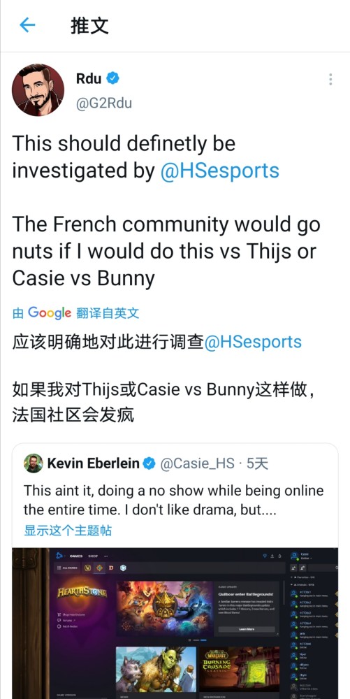 职业选手Kevin拿出了当时比赛时候的截图,上面显示当时xBlyzes战网在线,如果当时xBlyzes在电脑前肯定会显示邀请对战信息的,后来知名选手Rdu也转发了这条推特,强烈要求官方对此进行调查,并且表示如果是他打太子也这么干的话,那法国社区肯定要把他冲烂了。