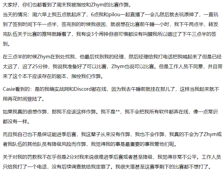 最后还是俱乐部助理打电话才喊醒xBlyzes,当xBlyzes想和Zhym开始比赛的时候,工作人员不同意,并且带来了迟到25分钟弃权的惩罚。xBlyzes表示自己从来没有想过作弊,更不可能帮助队友作弊,并且表示自己的事情才是最重要的,罚款的话他完全不在意,但是如果扣分可能会导致他没办法进季后赛。
