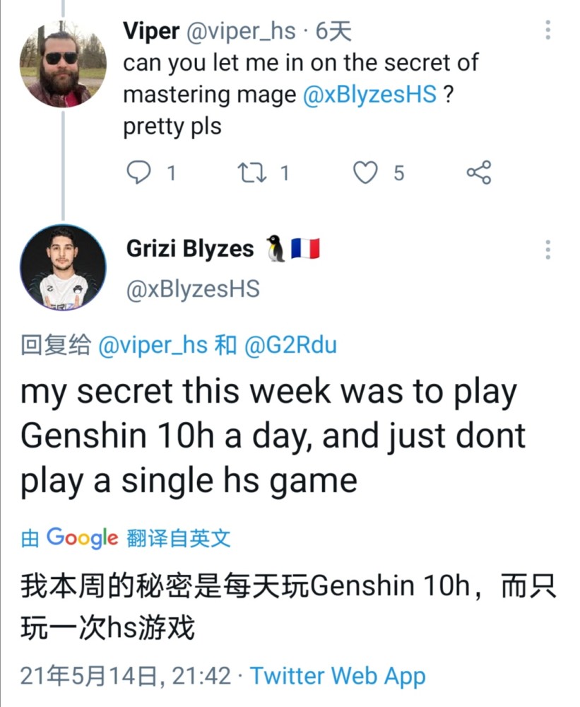 在清风写这篇文章的时候还发现了一个大部分媒体都没提到的小插曲,之前Viper问Rdu该怎么玩好法师,Rdu让他去咨询XBlyzes,结果xBlyzes非常“自豪”的坦言,自己本周的诀窍是每天玩十小时《原神》,而不是只玩炉石传说这一款游戏。这波啊,这波是米哈游打钱!