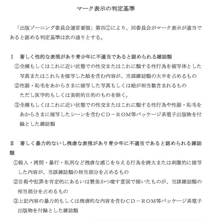 漫画、轻小说(含单行本、文库本和杂志,不含网络刊登):遵循出版业的分级制度——标记制度,分为「有害图书」和其他。