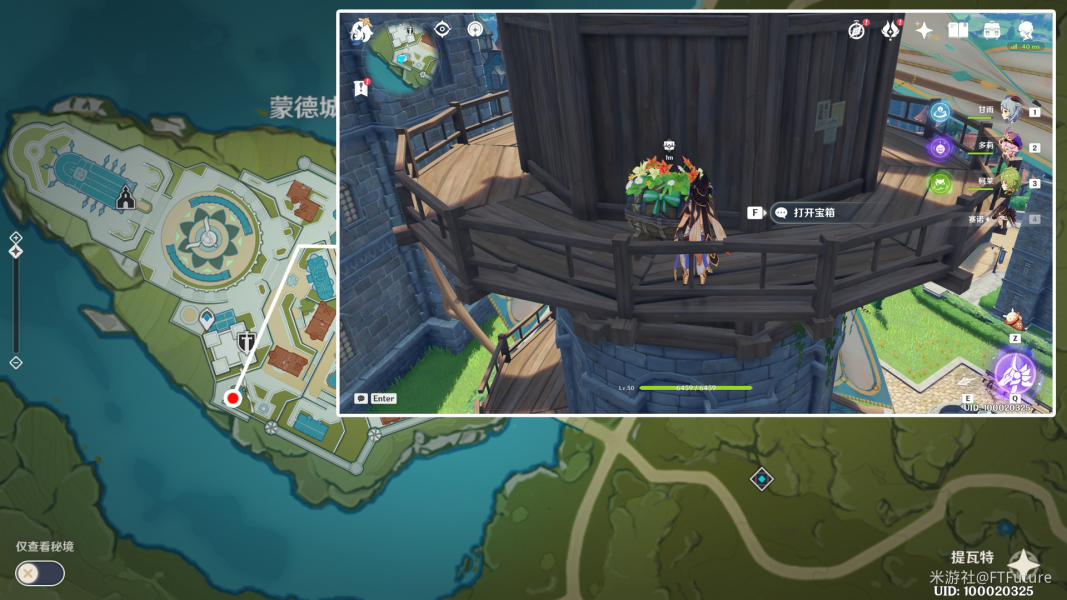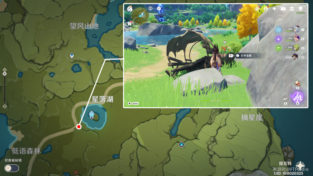 来到骑士团传送点北侧,前往如图位置,在风神雕像旁取得宝箱五。