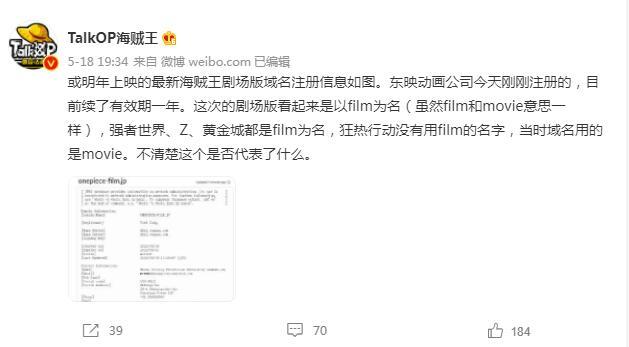 而近日,海贼王的粉丝爱好号“TalkOP海贼王”发布了最新海贼王剧场版域名注册信息,就在5月18号注册的,目前续了有效期一年。