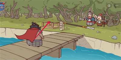1、玩家首先将张飞手中的武器放到长板桥上面,形成一个收费杆;