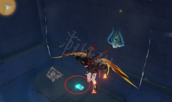跳下去,可以慢慢飞下去,中间会有一个平台,在这个平台的下面,我们可以看见下面有个仙灵,我们跟着仙灵走。