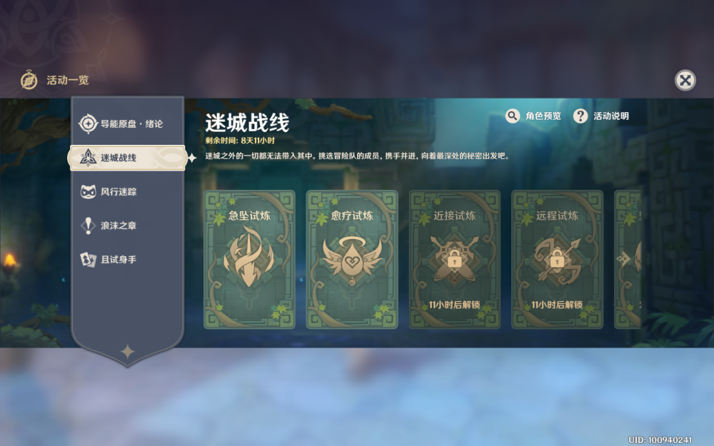 这个活动的乐趣之一就在于选择角色以及相应的buff上了,当然,原神之前的活动中也出现过类似的,这次最大的不同就是角色变成了系统决定的试用角色了。