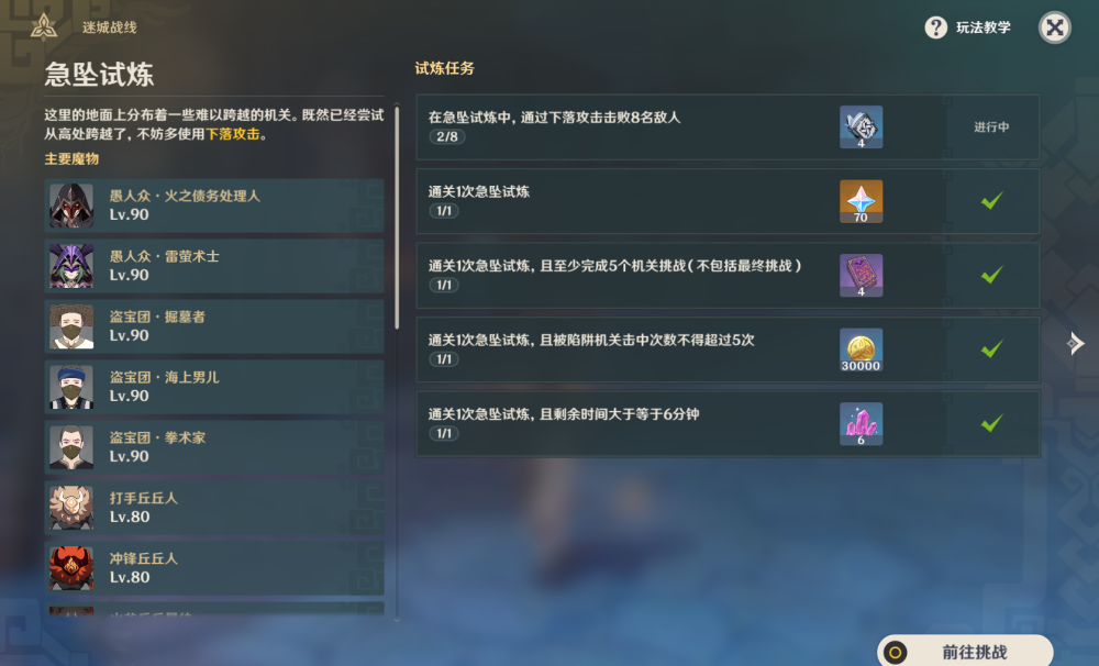 例如第一关急坠试炼中要带上阿贝多才能完成下落攻击击败8个敌人的成就,第二关需要带上一名奶妈才能完成治疗成就。