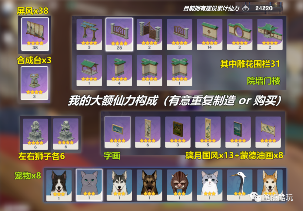 到目前为止,狮子一共6对(有意控制只买左不买右的洒脱),蒙德墙31墙+2门(胜在体积小,易摆设,解禁室外第3区之前买的多),璃月墙(为了第1区布景好看,谁来我家第一眼依然是美景),国风挂画13,西式油画8,合成台我也就3个,一个区1个,尽量保证每个区兼顾。
