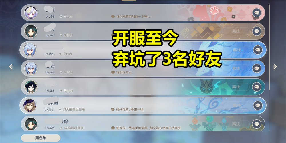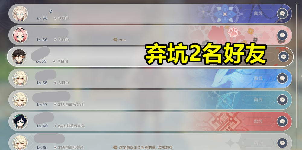 总体来看,在《原神》开服至今且只有早期添加了几个好友的14名玩家当中,好友的弃坑率四舍五入为32%,而在线率高达68%左右,即便去除非游戏初期的好友,数据很可能仍有60%。虽然统计的数量并不多,但也大差不差了。