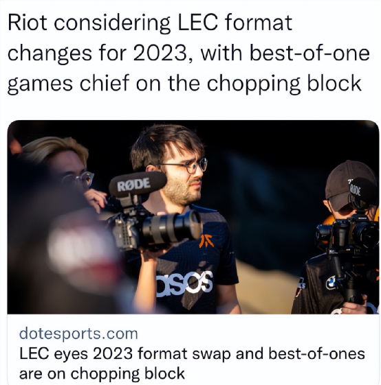 由于观赏性的原因,国内不少观众们并不太看LEC与LCS赛区的比赛。因而可能也不太了解他们的赛制。相较于LPL与LCK,欧美赛区的赛制不仅无法完全考验选手实力,并且也缺乏好的观赛体验。目前,LEC赛区实行的是BO1双循环,八周就能打完常规赛,甚至他们还有休赛期,一周会出现仅打两场比赛的情况。选手们大多都是做“一休二”,这个“一”甚至只有不到一小时。隔壁的LCS也是差不多的情况。而LPL实行的是常规赛BO3赛制单循环,所有队伍对阵一次后,进行积分排名,通过排名再进行季后赛BO5对决。这样的赛制实在是过于轻松,甚至达到了不科学的程度。在今年的S12中,由于独联体赛区的缺席,导致LEC赛区多出一个名额。彼时LEC解说Caedrel发推:“令人吃惊。MAD在一整年一个BO5都没赢的情况下进入了世界赛。与此同时,LPL赛区的LNG打了7个BO5却止步世界赛。”这也让拳头考虑将在明年对LEC的赛制进行修改。
