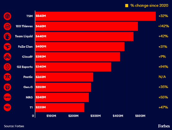 除此之外,相较于赛事成绩,欧美赛区似乎更喜欢把电竞当生意来做。据福布斯发布的《2022世界最具价电竞俱乐部》榜单中,欧美俱乐部占据其中8席名额,其中的Faze Clan更是完成上市,并估值超过10亿美元。虽然他们的《CS:GO》成绩不错,但他们的业务重心更在MCN、潮牌等内容上。此前比较流行的NFT、元宇宙等与电竞的结合,也几乎都发生在欧美地区。结语: