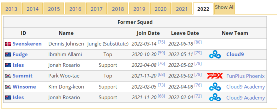 图片源于网络根据数据网站OPGG的统计,在2021年5月的最后一周,全球玩家即时在线人数达到13706477(1370万)。从图片中能够看到,北美在线人数为150万,而西欧则是290万,两大赛区相加才勉强超过LCK赛区。玩家基数低,也是天才选手们匮乏的重要因素。目前欧美赛区的战队组建甚至有点像国内游戏直播的早期模式—买人。今年年初,豪强队伍TL就组建了一支由前FNC打野Bwipo、“北美法王” Bjergsen、天才AD Hans Sama以及冠军辅助CoreJJ的“银河战舰”。身为北美的一贯强队需要通过买下所有的选手来组建一支“银河战舰”,其余队伍对于自身战队人才的培训更是不必多说。并且,通过选手们的国籍也能看出北美的人才凋零。下图中,北美赛区的战队C9找不出一个美国人。