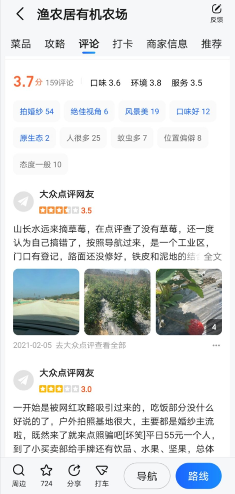 如果你担心旅行途中的饭店、景区不好玩,我推荐你使用——高德地图,只用来导航就浪费了,在地图APP上评论的人基本是顺着地图找过去的人,和专门的景区饭店推荐平台相比,高德地图虽然评论总数不多,但是信息量给的很够。