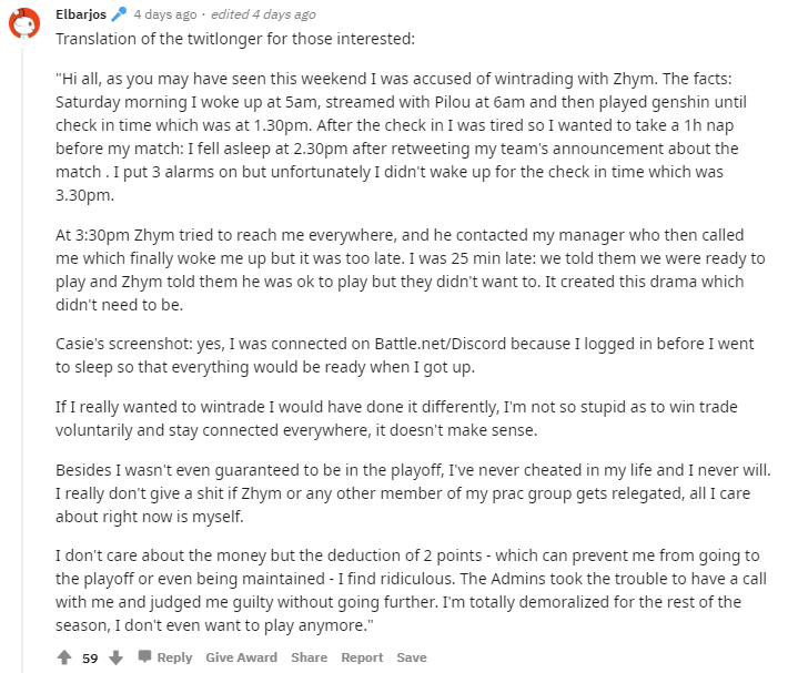 随着舆论愈发激烈,xBlyzes 最后选择亲自讲述这件事的真相,他表示他只是因为沉迷《原神》刷圣遗物,导致他在比赛前整个人精神过于萎靡,在比赛日决定小憩一番,然而没想到他这一睡直接就错过了比赛。