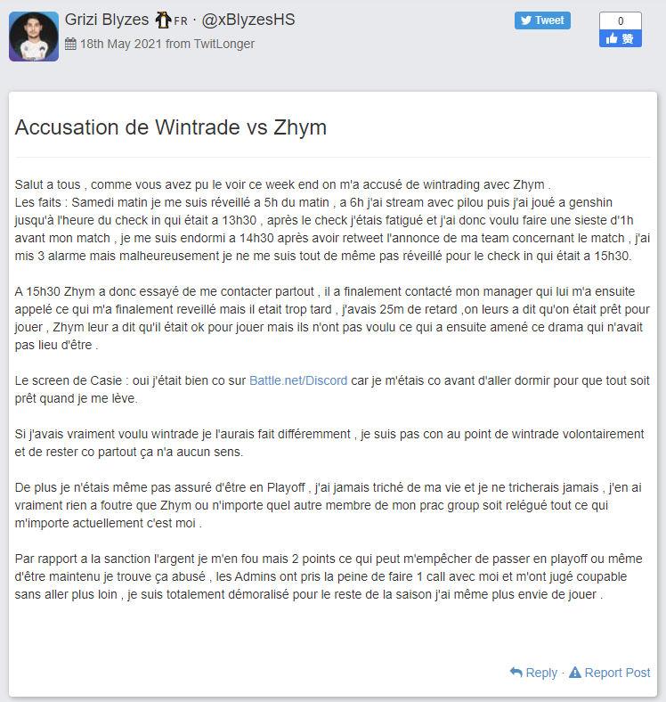 在 5 月 15 日《炉石传说》职业比赛中,一位名为 xBlyzes 的法国重量级冠军选手,他曾获得本年度炉石大师赛二连冠纪录,却因为沉迷《原神》缺席了大师赛第五周的比赛,被裁判视为“投降”,所以对手 Zhym 不战而胜,因此在海外炉石圈掀起了海啸般的讨论。