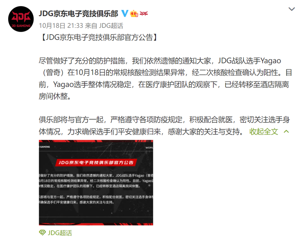 而LPL的这三支队伍,实力最强、状态最好的毋庸置疑,一定是JDG,不仅完成了对DK的双杀,同时也是以小组第一晋级8强。并且在EDG、RNG已经6人确诊的情况下,JDG还没出现这种情况,所以几乎所有LPL观众都希望JDG能逃过一劫,但万万没想到,JDG最终还是中招了,就在这天晚上JDG的官博传来坏消息,中单选手yagao核酸检查结果确定为阳性,目前已经进行隔离。