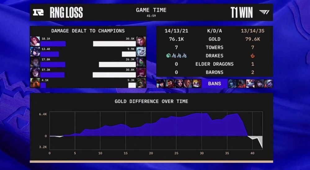 RNG与T1的第二局比赛,一度是领先了六千多的经济,所有观众都觉得比分要变成1-1的时候,RNG的几波决策连续出现失误,尤其是远古龙的那一波开团,直接导致了本局比赛的失利。