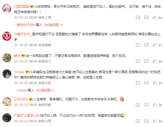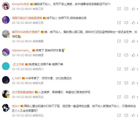 在RNG惨遭失利的赛后,LPL老牌解说米勒坦言T1的确在整体实力和战术运营上强于RNG,他们对RNG的BP战术了解得十分透彻,RNG技不如人输得心服口服。而在RNG的官博上,粉丝们纷纷在官博留言安慰选手:人生有梦,各自精彩;技不如人啊,不过也打出一点t1的东西,希望京东能赢吧;技不如人,输得也服气。 剑不断,指不烂,明年我还来继续剑指!五年了,年年如此,我已经释然了!