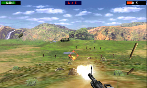 使用机枪射击士兵。 当自己没有干掉运兵战车或者是没有干掉运兵飞机的时候,就会出现大批量的士兵,会到达一定的射击范围内,向你攻击,尤其是扔手榴弹的,杀伤力很强,所以需要使用机枪射击,点击左键就会发射子弹,再点击不动,慢慢的向士兵身上安卓,就可以运用机枪,杀死士兵了。