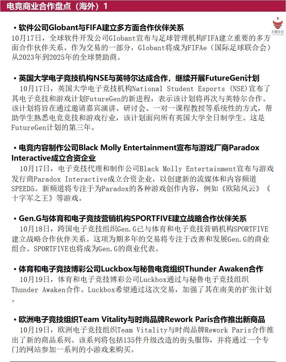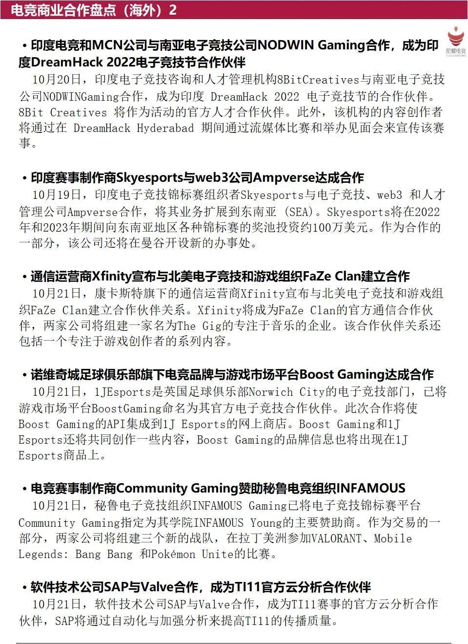 如本周软件技术公司SAP与Valve合作,成为TI11赛事的官方云分析合作伙伴,通过自动化与加强分析来提高TI11的传播质量; 软件公司Globant与FIFA建立多方面合作伙伴关系,成为FIFAe(国际足球联合会)从2023年到2025年的全球赞助商等等。
