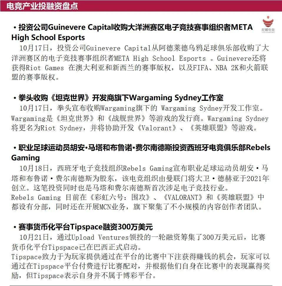 根据陀螺电竞的不完全统计,本周电竞产业投融资事件共有4起。