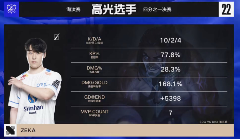 此役过后,EDG成为了S赛历史上第2支被让2追3的队伍,而第一次S赛上的让2追3,是TES让2追3击败FNC。必须要承认的是,EDG的硬实力相比DRX还是有着明显的差距,打到最后几乎是全线劣势,赛后分锅也完全没有必要。相比之下DRX这支队伍则是显得非常励志,之前ZEKA曾到LPL打过比赛,结果被左手和小学弟各种暴打,最后灰溜溜地离开了LPL,没想到这次S赛上的表现却盖过小学弟一头。