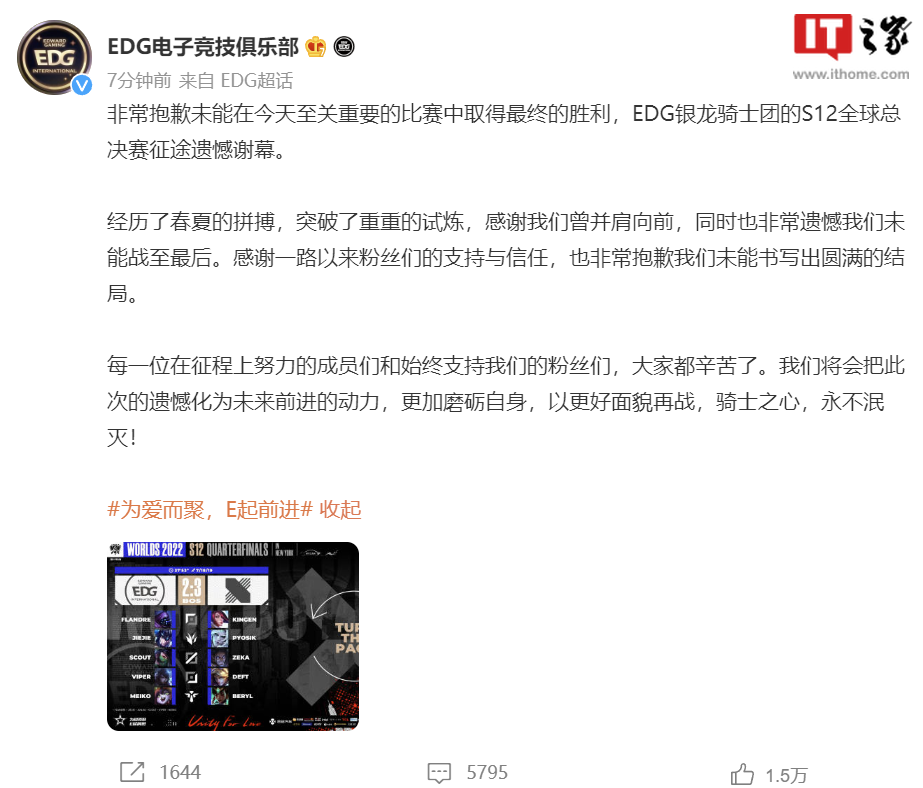 IT之家了解到,EDG 电子竞技俱乐部对此官方表示,非常抱歉未能在今天至关重要的比赛中取得最终的胜利,EDG 的 S12 全球总决赛征途遗憾谢幕。“感谢一路以来粉丝们的支持与信任,也非常抱歉我们未能书写出圆满的结局。”