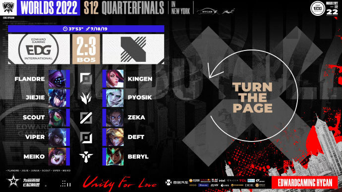 IT之家 10 月 24 日消息,今日,英雄联盟 2022 全球总决赛迎来四分之一决赛的第四个比赛日。LPL 赛区三号种子 EDG 被 LCK 赛区四号种子 DRX 让二追三,止步八强。后者将与同样来自 LCK 赛区的 GEN 会师半决赛。