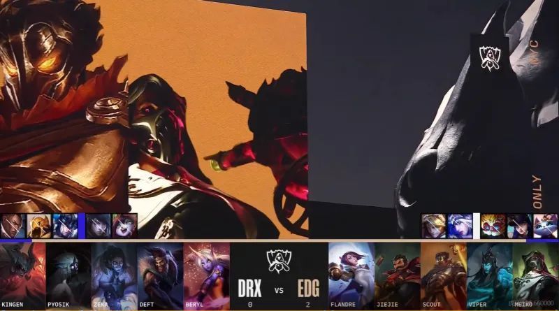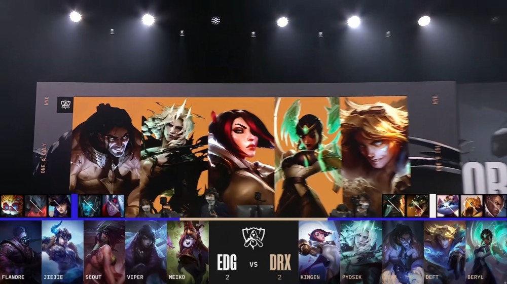 决胜局,EDG蓝色方,禁用大头,剑魔,女警,滑板鞋,韦鲁斯,选用Flandre武器大师、Jiejie猪妹、Scout阿卡丽、Viper厄斐琉斯、Meiko璐璐;DRX红色方,禁用卢锡安,沙皇,猫咪,鳄鱼,船长,选用Kingen剑姬、Pyosik破败之王、Zeka塞拉斯、Deft伊泽瑞尔、BeryL扇子妈。