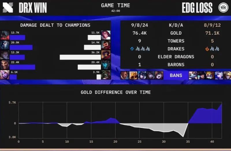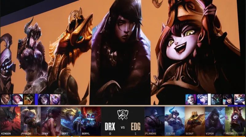 第一局比赛,DRX蓝色方,禁用卢锡安,瑞兹,猪妹,韦鲁斯,伊泽瑞尔,选用Kingen剑姬、Pyosik男枪、Zeka发条、Deft艾希、BeryL大头;EDG红色方,禁用猫咪,女警,剑魔,塞拉斯,维克托,选用Flandre凯南、Jiejie盲僧、Scout沙皇、Viper希维尔、Meiko奶妈。