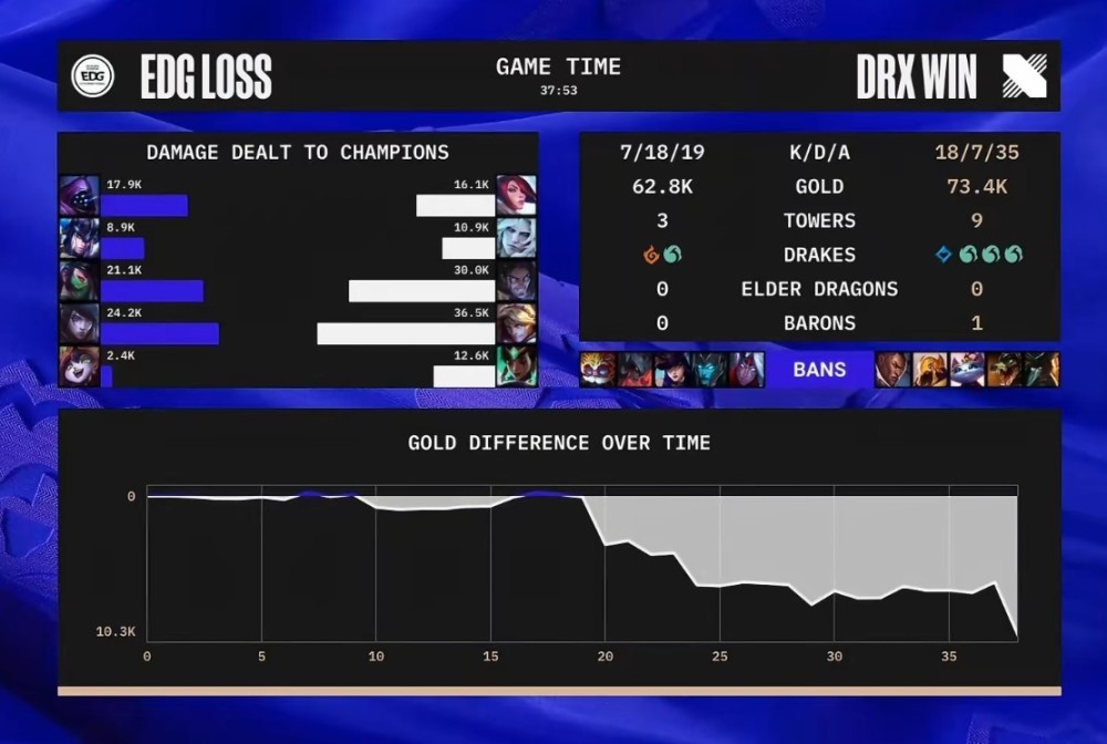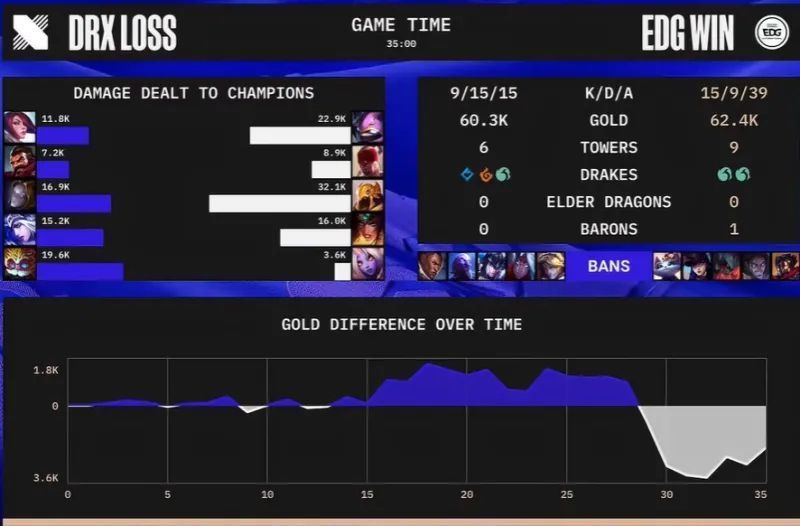 当所有人,都认为手握三个赛点,且将比赛拖到了7点钟的EDG,会轻松拿下比赛的。可惜,往往会事与愿违。第三局比赛中,双方争夺得更加激烈。在长达43分钟的比赛里面,优势几经转手。EDG打了35分钟的好局,一度经济领先近4K。可惜的是34分钟左右,DRX迎来了转机,EDG强推无果后,DRX顺势反打完成一波0换3团战,并斩获大龙,瞬间逆转经济,随后顺风顺水翻盘成功。