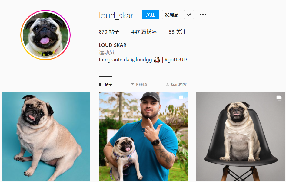 甚至LOUD电竞俱乐部养的狗,在Instagram上都有447万的粉丝。