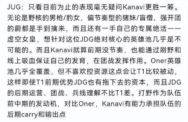 而打野位置的对比,这篇分析长文的作者认为Kanavi要比Oner更强,无论野核男枪、豹女,还是偏节奏型的猪妹和盲僧,这些英雄在Kanavi这里都是信手拈来。因此在英雄池方面T1根本不可能限制Kanavi,打野位的比拼上JDG要略胜对手一筹。