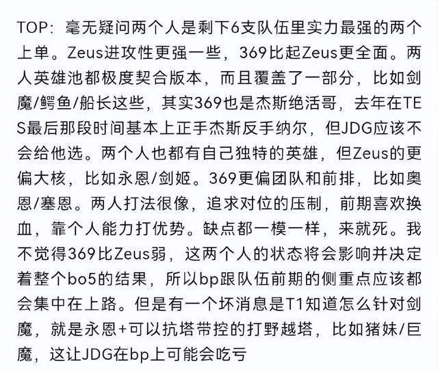 在上单位置的比拼上,这位网友分析认为369相比Zues要更加全面,虽然后者的进攻性要更强一些,比如369不仅可以选出杰斯、鳄鱼以及船长这些靠着个人能力也能Carry比赛的英雄,也可以拿出奥恩、猪妹这样偏团队、工具人角色的上单。