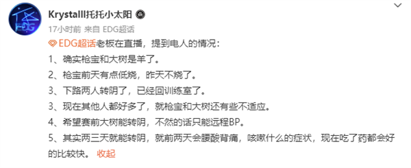 那就是EDG战队的老板在突然开启的直播当中,聊到了关于选手们的事情,其中队伍当中的下路双人组是已经全部转阴,但是整体情况却不明朗。因为圣枪哥和主教练茂凯也病了,其中圣枪哥前天更是有点低烧,好在现在已经不烧了,但是他是直接缺席了训练赛。