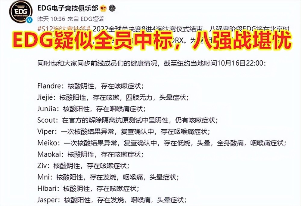 更糟糕的是,圣枪哥和茂凯在休赛期中被检出羊了;Viper和Meiko是在小组赛期间就一直羊着;Scout虽然刚由阳转阴的,但鉴于上述后遗症,囧王者对于EDG的比赛,表示谨慎看好吧。