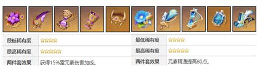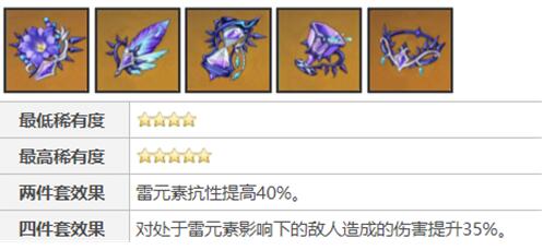 2、平雷4件套纯雷队来说增强最大的圣遗物,神子的配队搭配必是纯雷队,基本全程能吃到这35%的增伤效果,基本可以算目前最强的圣遗物搭配了,但是对于队伍的配置要求高属于毕业圣遗物。