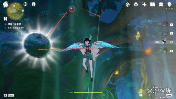 我们通过出现的四叶印和风场靠近大树。首先通过抓取四叶印,然后通过白圈,最后乘坐风场。