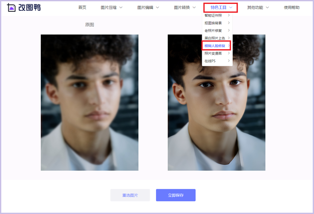 我们打开之后点击【特色功能】选择【模糊人脸修复】功能,上传模糊照片之后它就会自动修复好,修复完成之后点击保存就可以啦~