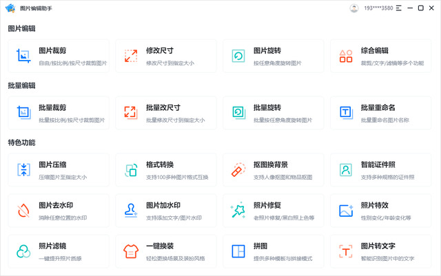 图片编辑助手是一款电脑图片编辑应用,它支持几十种常见的图片处理工具,包括图片裁剪、压缩、格式转换以及拼图等,使用起来比较简单,适合不会修图的新手。