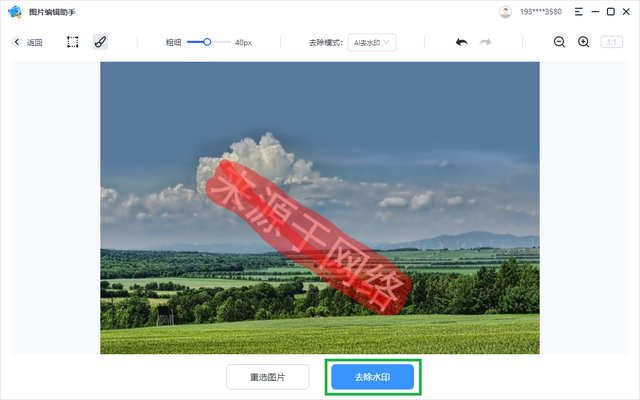 点击「图片去水印」功能,上传需要去除水印的图片,使用上方的画笔工具或框选工具选择水印区域,点击「去除水印」。