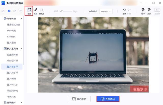 第二步:选择选择左上角的【矩形】,然后框选需要去除水印的区域,接着点击【去除水印】,软件就会自动进行水印去除了。